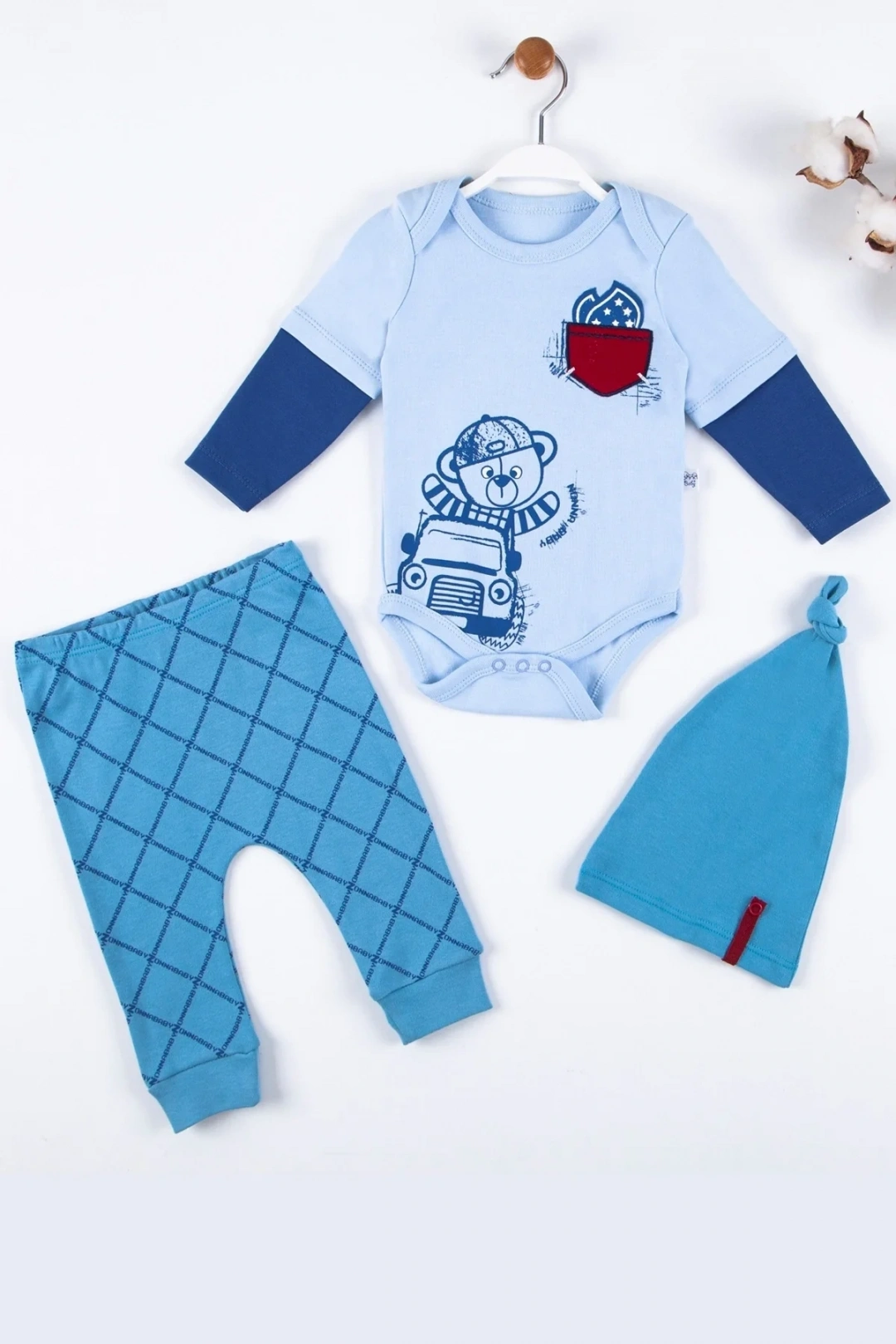 Cep Nakışlı Bear Desenli 3'lü % 100 Pamuklu Erkek Takım Ürün Türkiye'de, Cilde Dost Kumaştan Üretilmiştir.