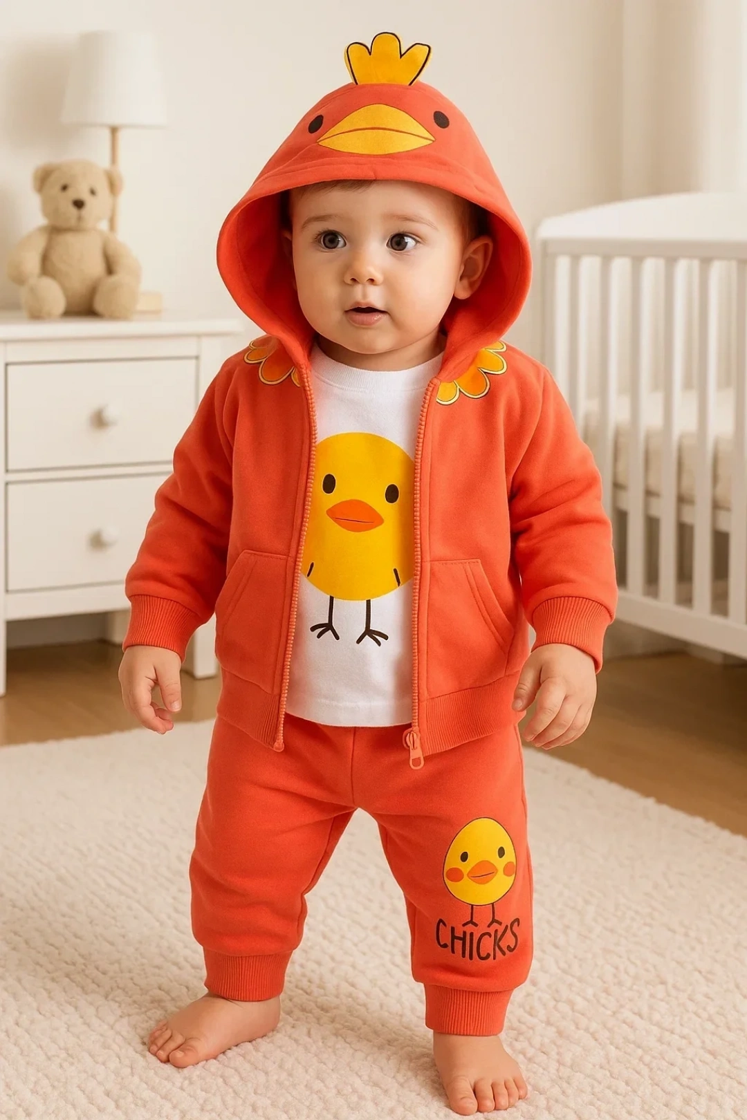 Civciv Desenli Kapişonlu 3'lü Erkek Bebek Takımı Ürün Türkiye'de, Cilde Dost Kumaştan Üretilmiştir Kalınlık Orta Kalılıktır. 4 Mevsim Kullanıma Uygundur. % 100 Pamuk Penye Kumaştır.