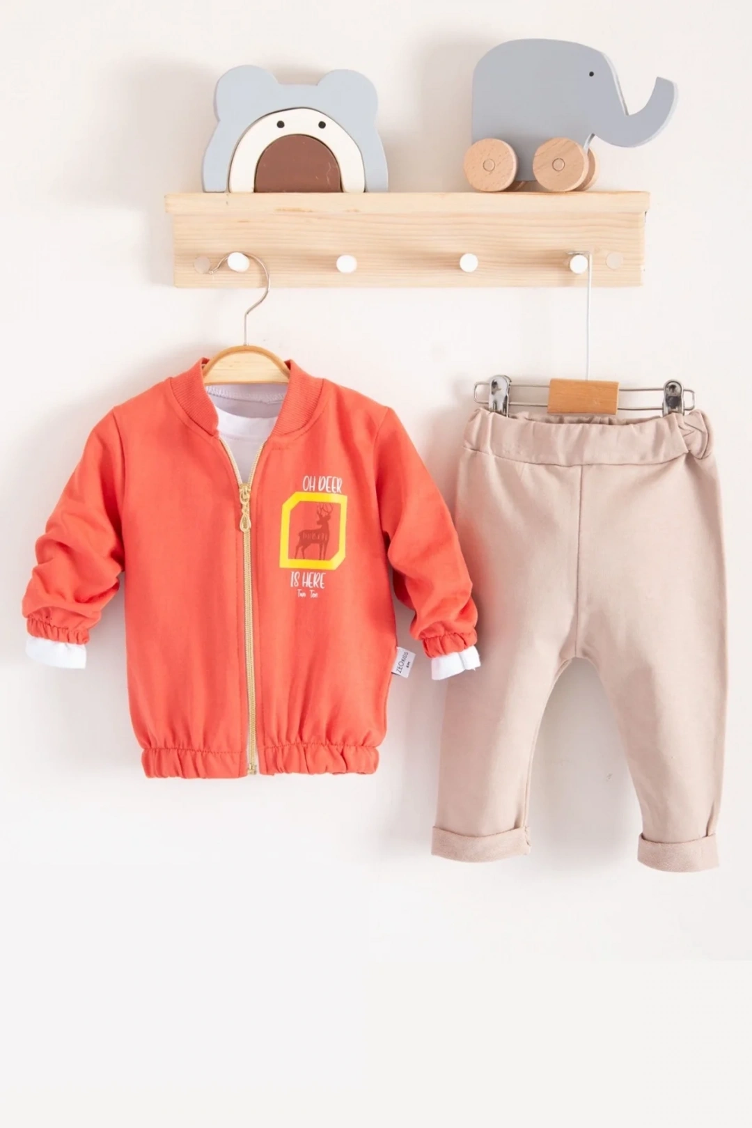Geyik Desenli Hırkalı 3'lü Erkek Bebek Takım. Ürün Türkiye'de, Cilde Dost Kumaştan Üretilmiştir