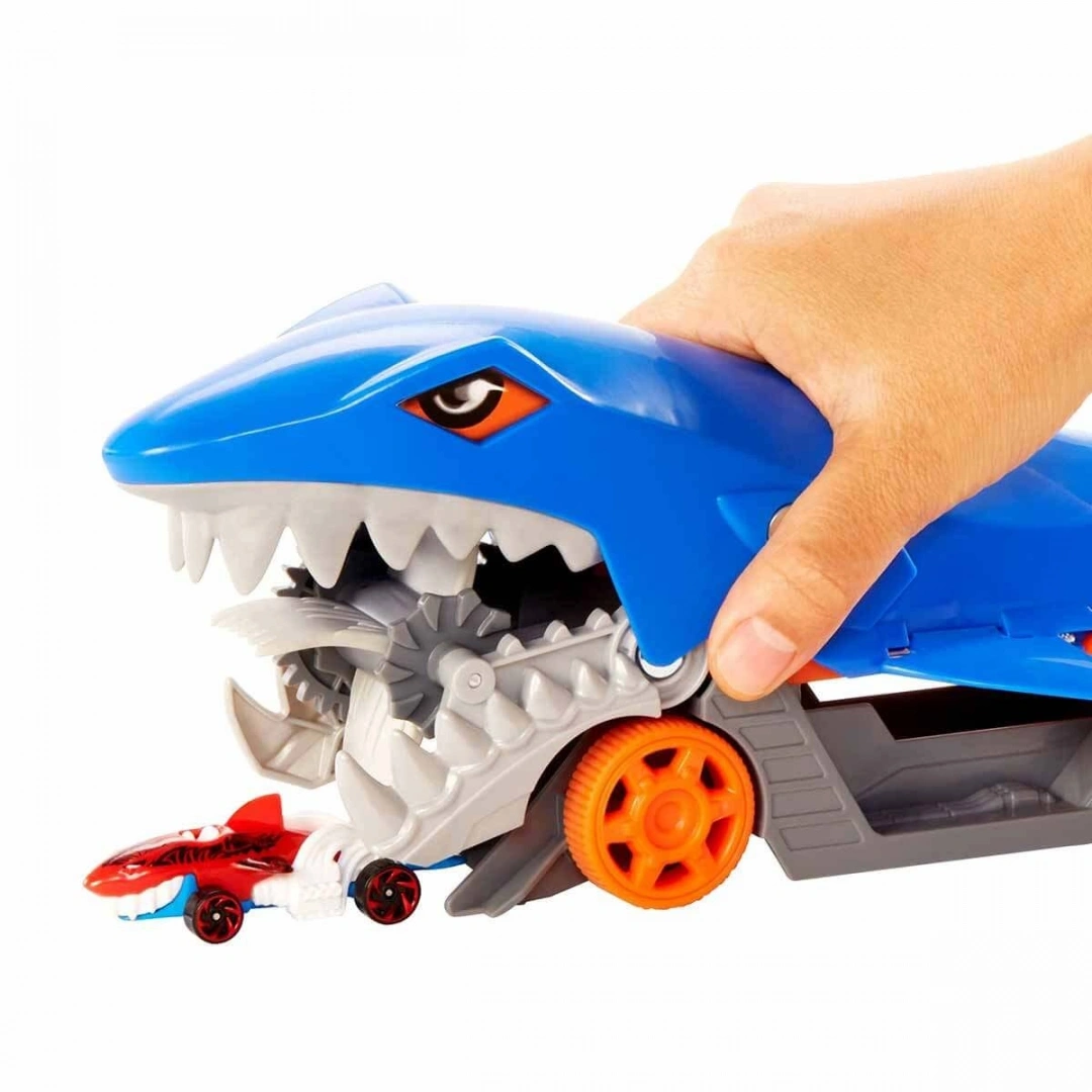 Bu köpek balığı şekilli süper havalı taşıyıcı, arabaları yutup karnında saklayarak Hot Wheels® araçlarını taşımanın benzersiz ve eğlenceli bir yolunu sunar.