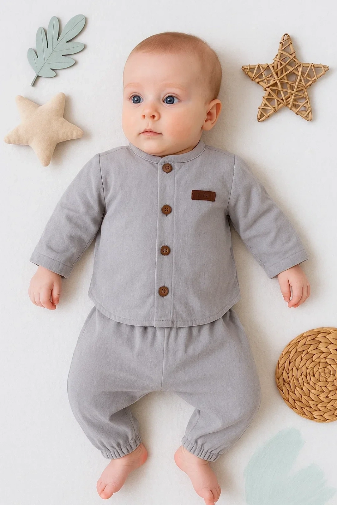 Oval Kesim 5 Düğmeli Müslin Kumaş 2'li Erkek Bebek Takımı Ürün Yazlık Kumaşa sahiptir. Jakarlı nefes alan yapıya sahiptir. Ürün Türkiye'de, Cilde Dost Kumaştan Üretilmiştir